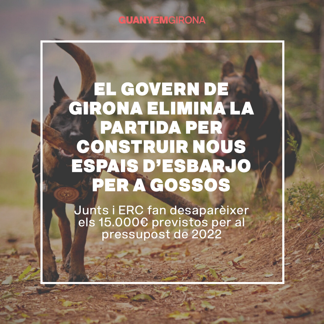 Recentment Girona va a aprovar el pressupost de l’any 2022. Junts i ERC van sumar el suport d’un diputat expulsat de Ciutadans per a fer-ho. Des de Guanyem Girona s’ha mirat al detall els nous comptes i hem observat que ha caigut la partida per augmentar els espais d’esbarjo per a gossos. Els 15.000€ han desaparegut sense cap explicació.