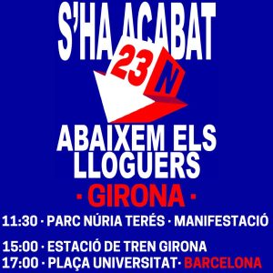 Guanyem Girona denuncia la greu situació dels lloguers i ha anunciat el seu suport a la manifestació convocada aquest dissabte, 23 de novembre, pel Sindicat de Llogateres i el moviment per l’habitatge per exigir una rebaixa dels preus del lloguer. Hi haurà una mobilització al matí a Girona i una a la tarda a Barcelona, amb l’objectiu de visibilitzar una problemàtica que afecta tota la ciutadania, de la ciutat i el conjunt del país, i exigir mesures per fer-hi front.