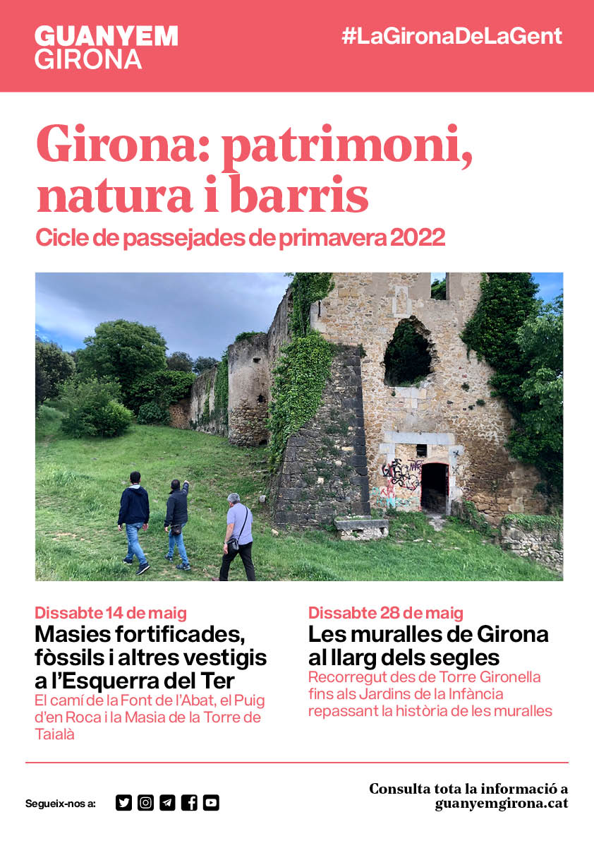 Degut a l’èxit de la iniciativa, enguany Guanyem Girona vol repetir-la. Per això el proper dissabte 14 de maig el cicle “Girona: patrimoni, natura i barris” tornarà amb la passejada “Masies fortificades, fòssils i altres vestigis a l’Esquerra del Ter”. El regidor gironí i gran coneixedor de l’entorn de la ciutat, Pere Albertí, organitzarà un recorregut que s’iniciarà a les 9.30h a l’avinguda Amical Mauthausen, davant del camp de futbol. Des d’allà es pujarà a un mirador poc conegut amb vistes a la ciutat i s’explorarà el Puig d’en Roca per descobrir un jaciment paleolític i conèixer el passat geològic de la zona i la influència prehistòrica del Ter. Per acabar es visitarà la Torre de Taialà, una casa forta del s.XV abandonada però qualificada com a Bé Cultural d’Interès Nacional i que dona nom al barri que té als seus peus.
